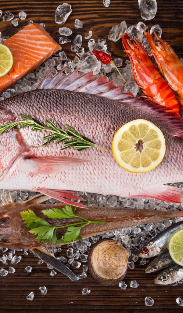 Обои Свежая рыба с креветками и кусочками лимона лежит на кусочках льда