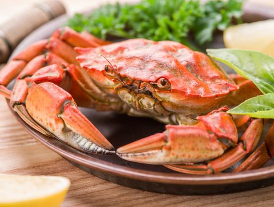 Обои Большой вареный краб на тарелке с листьями салата