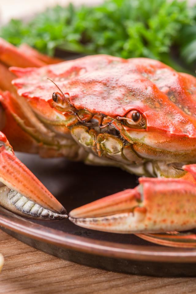 Обои Большой вареный краб на тарелке с листьями салата