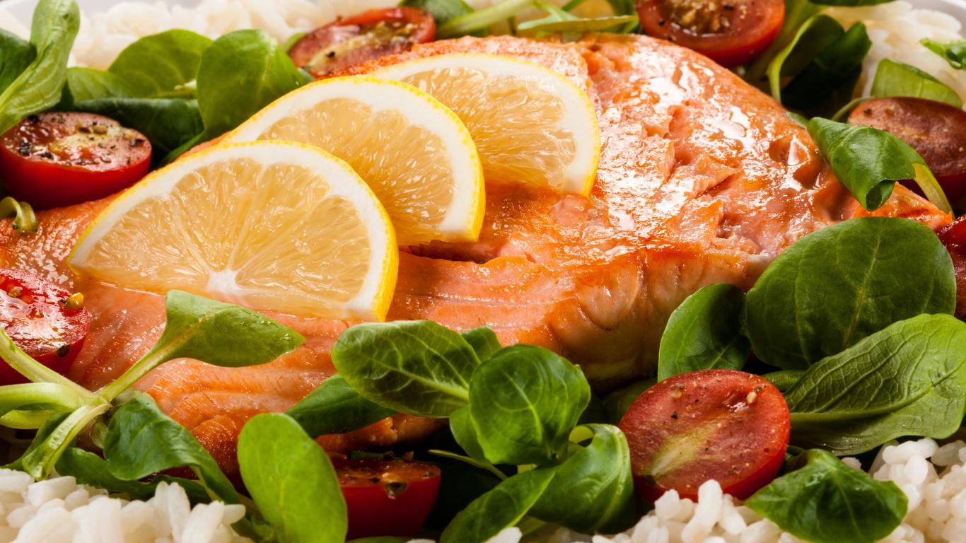 Обои Жареная красная рыба с лимоном, помидорами, шпинатом и рисом