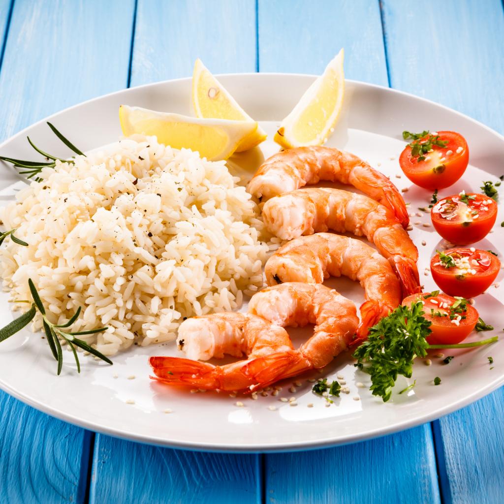 Обои Креветки на тарелке с рисом, помидорами и лимоном