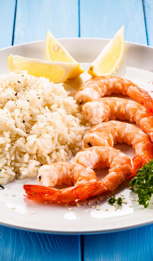 Обои Креветки на тарелке с рисом, помидорами и лимоном