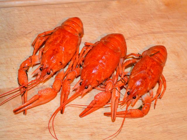 Обои Три красных вареных рака лежат на деревянном столе