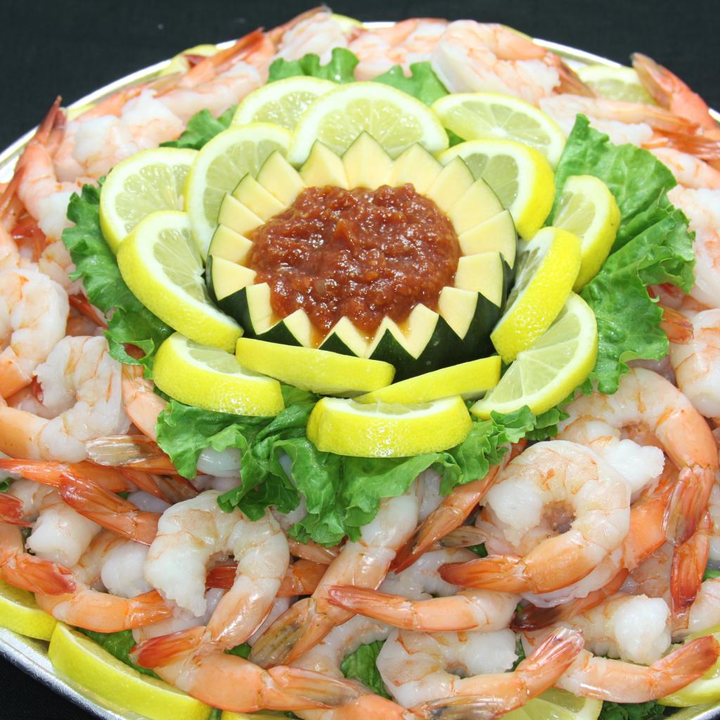 Обои Вареные креветки с лимоном и соусом на большой тарелке