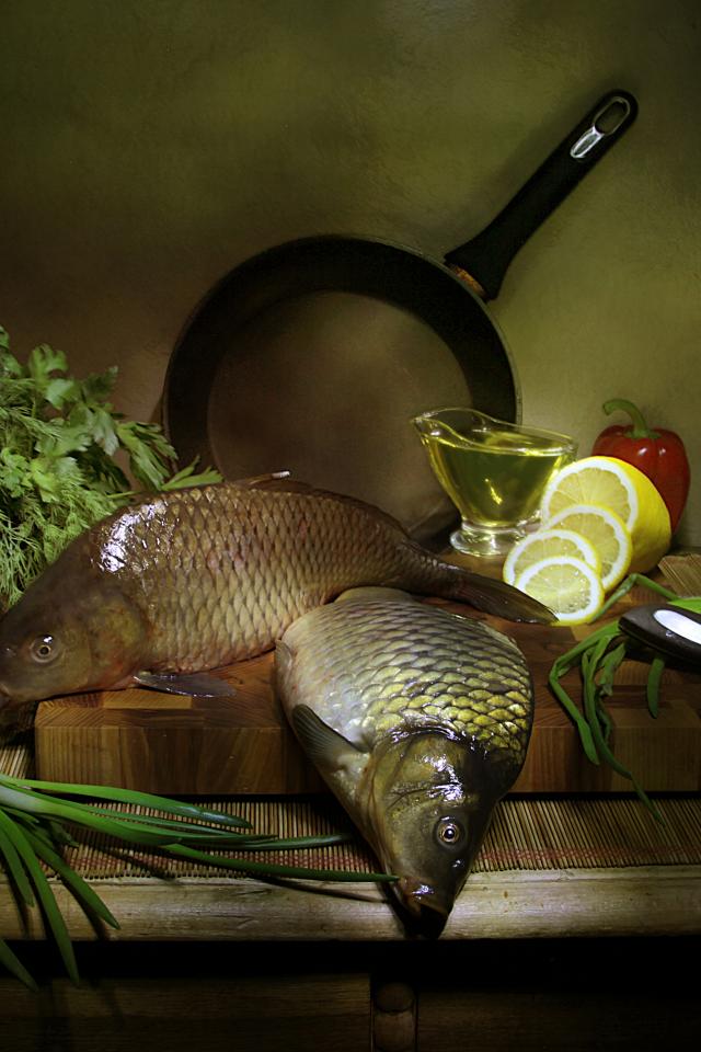 Обои Сырая рыба на столе с зеленью, лимонами и луком