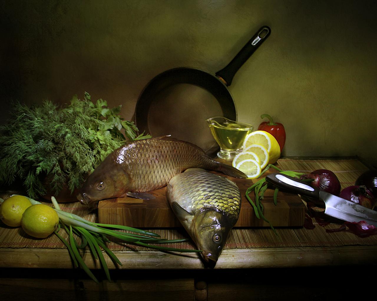 Обои Сырая рыба на столе с зеленью, лимонами и луком