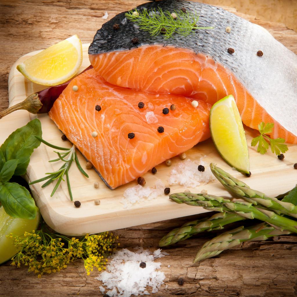 Обои Филе красной рыбой на столе со спаржей и лаймом