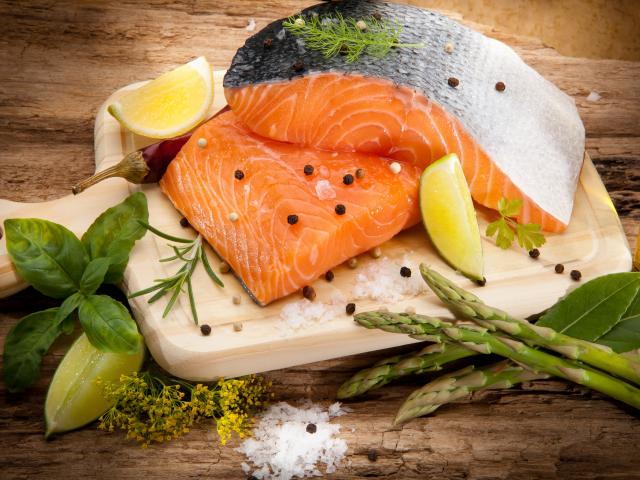 Обои Филе красной рыбой на столе со спаржей и лаймом