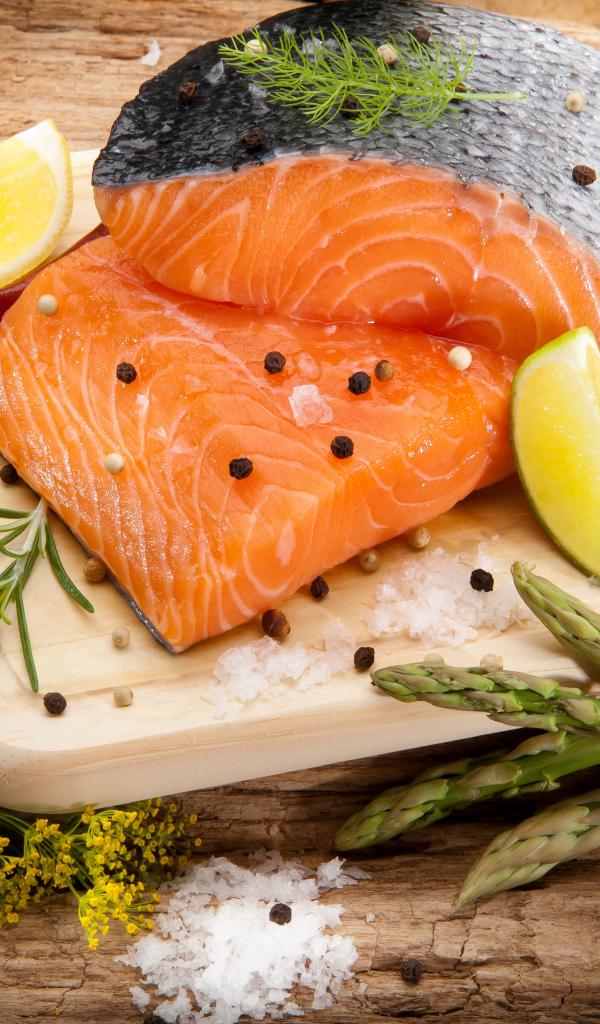 Обои Филе красной рыбой на столе со спаржей и лаймом