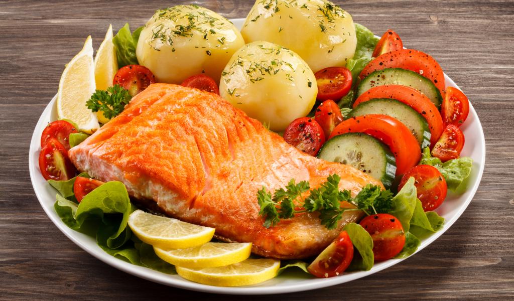 Обои Кусок жареной рыбы на тарелке с овощами