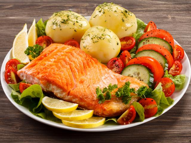 Обои Кусок жареной рыбы на тарелке с овощами