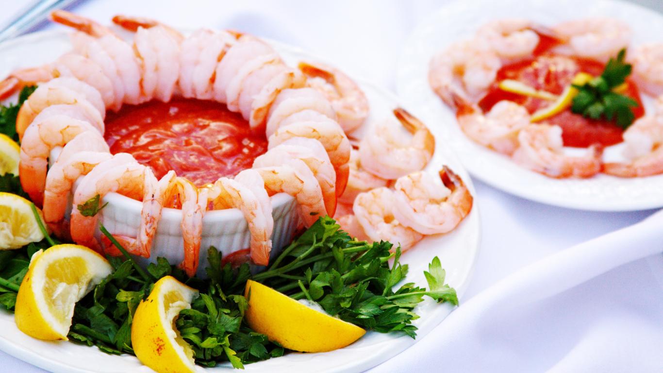 Обои Вареные креветки с соусом на тарелке с лимоном и зеленью петрушки