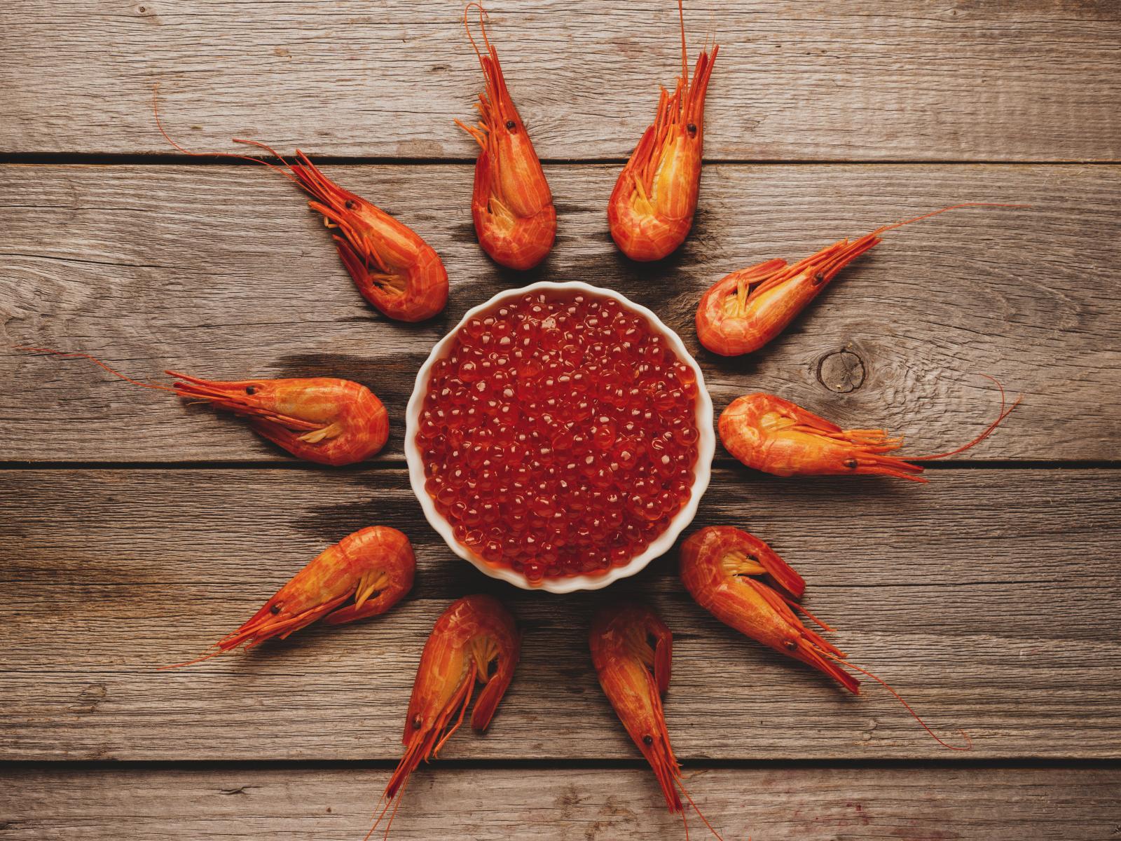 Обои Вареные креветки на столе с красной икрой