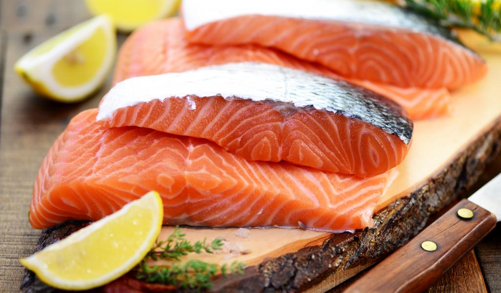 Обои Кусочки красной рыбы с лимоном на столе