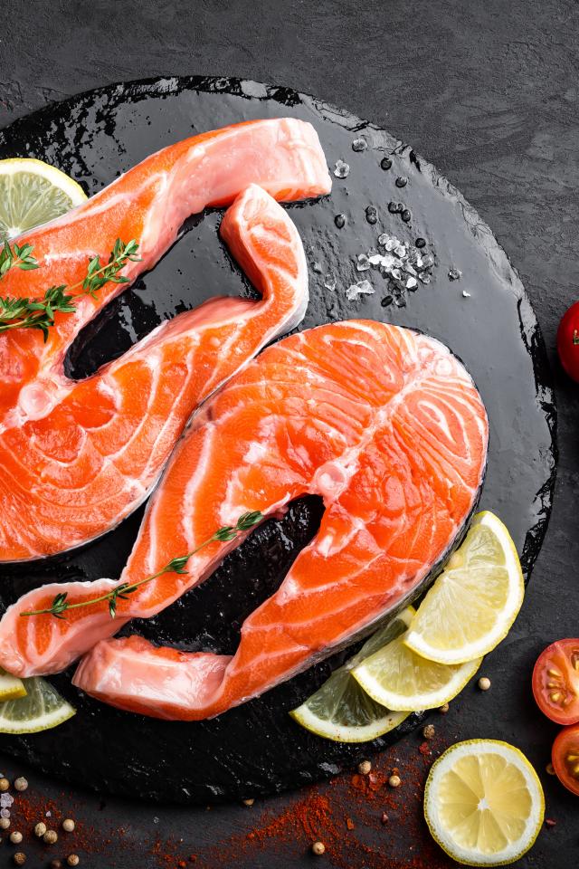 Обои Два куска красной рыбы с овощами на черном фоне