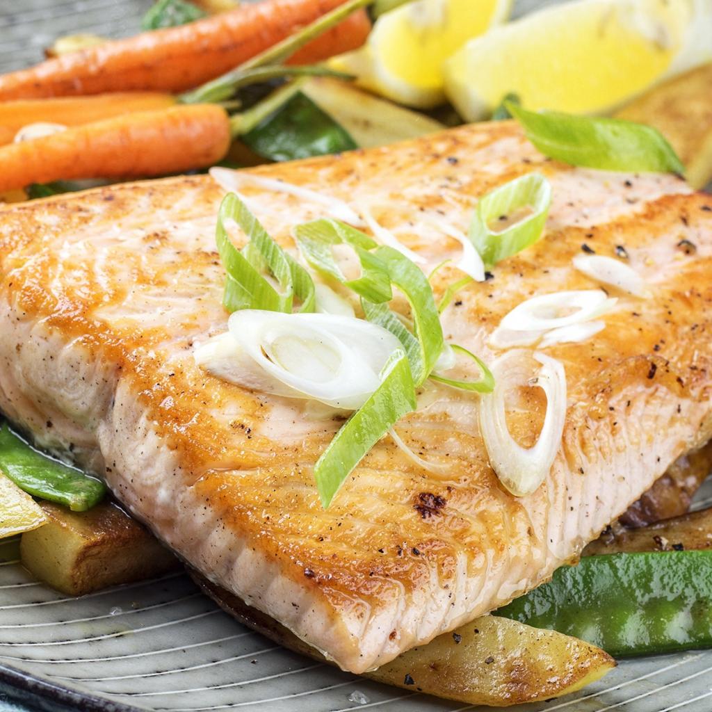 Обои Запеченная красная рыба с овощами на тарелке