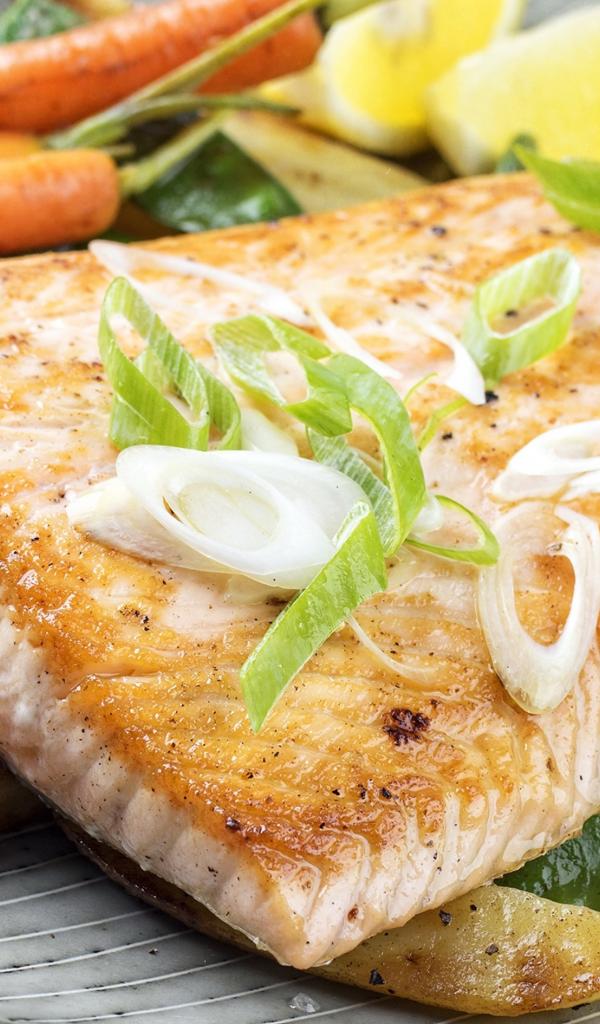 Обои Запеченная красная рыба с овощами на тарелке