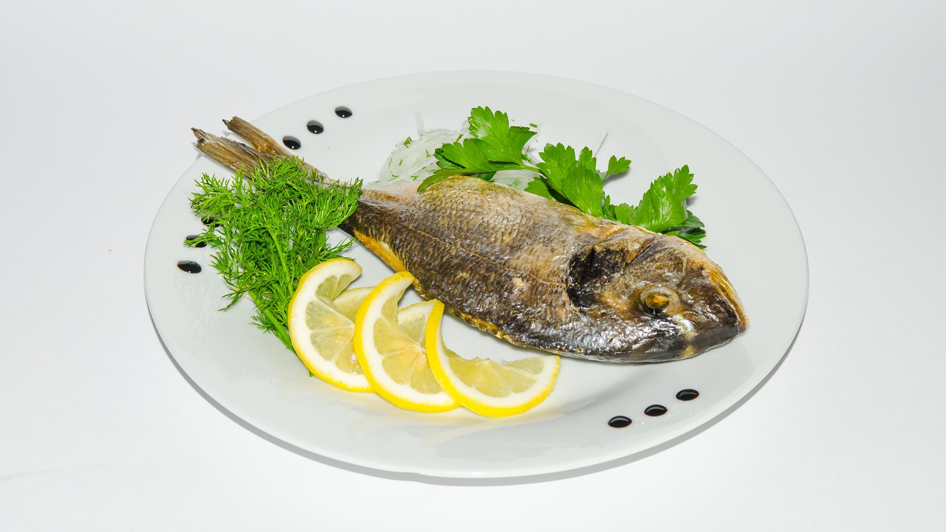 Обои Запеченная рыба на тарелке с лимоном и зеленью