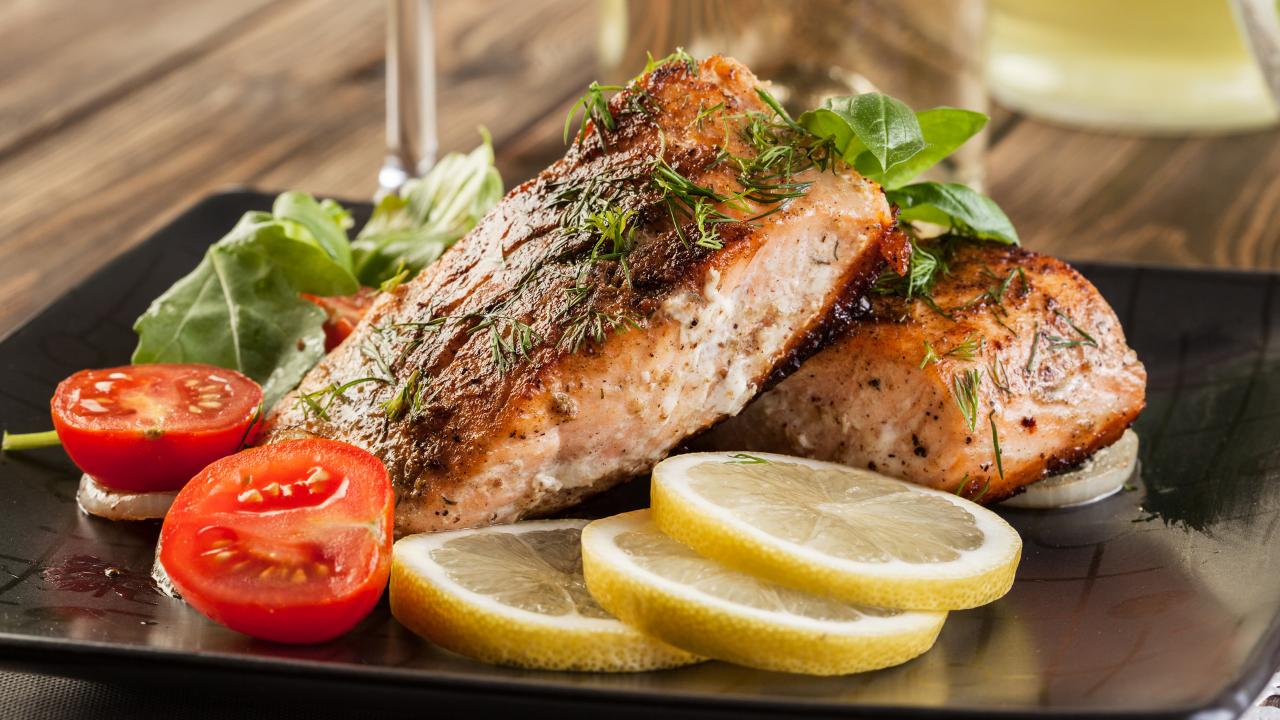 Обои Куски запеченной рыбы на тарелке с помидорами и лимоном