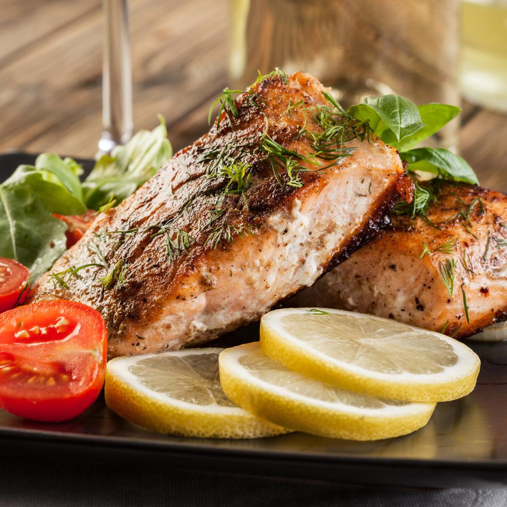 Обои Куски запеченной рыбы на тарелке с помидорами и лимоном