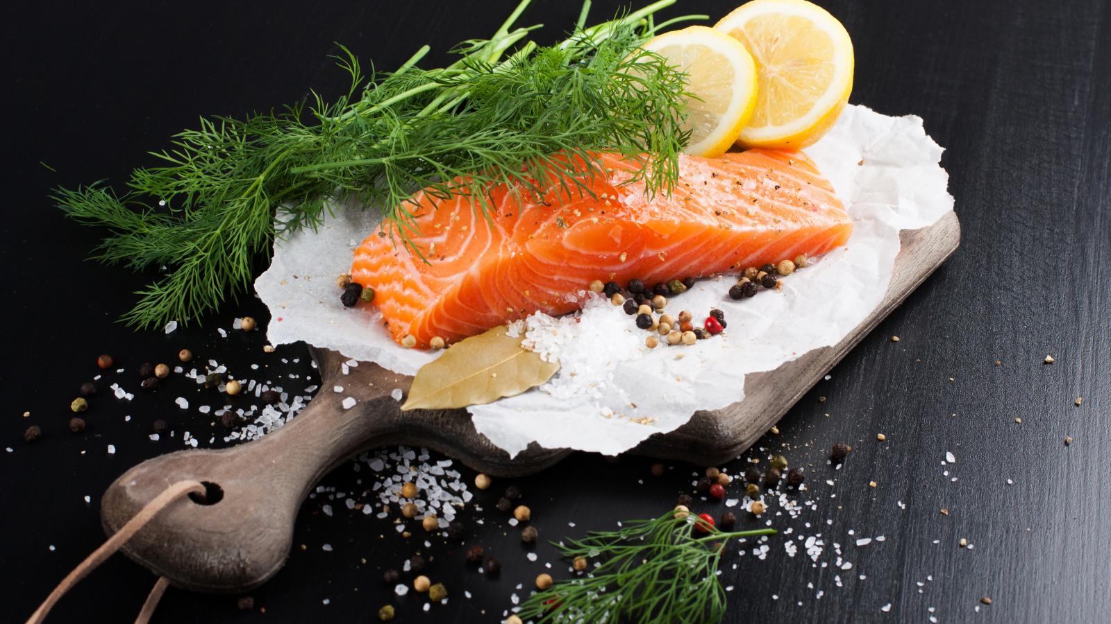 Обои Кусок красной рыбы на доске с укропом и лимоном