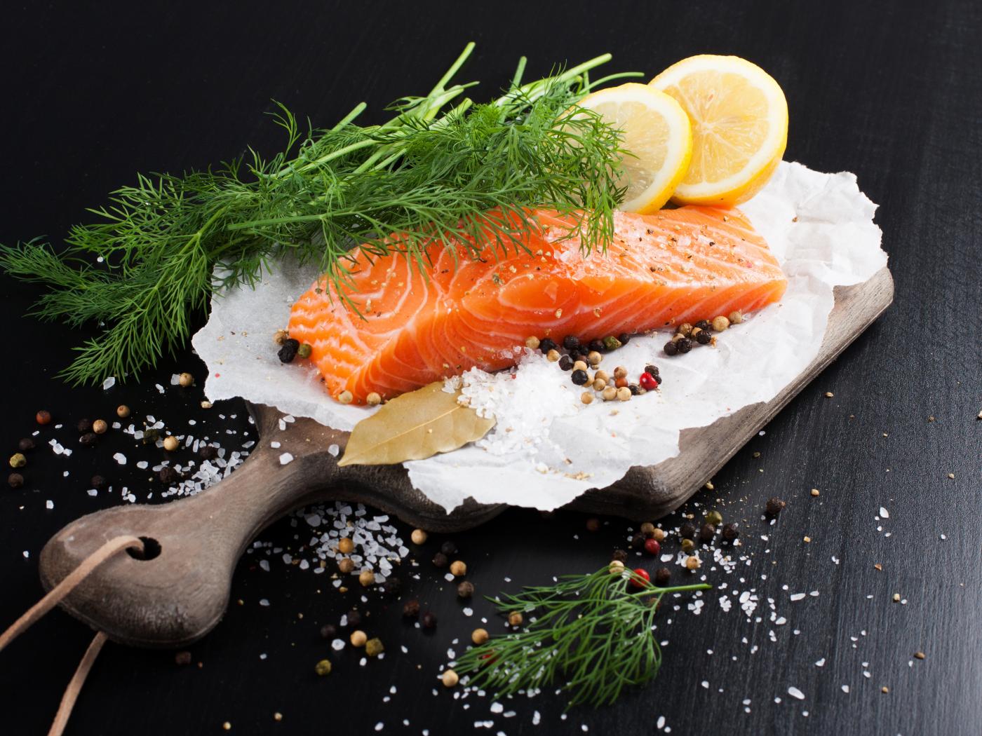 Обои Кусок красной рыбы на доске с укропом и лимоном