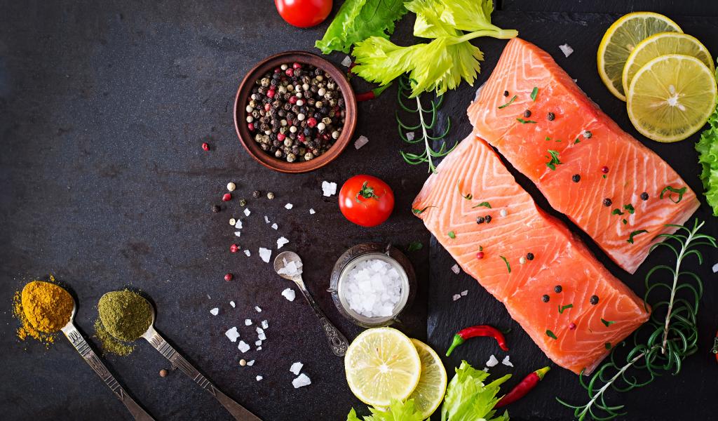 Обои Куски красной рыбы на столе с лимоном и специями