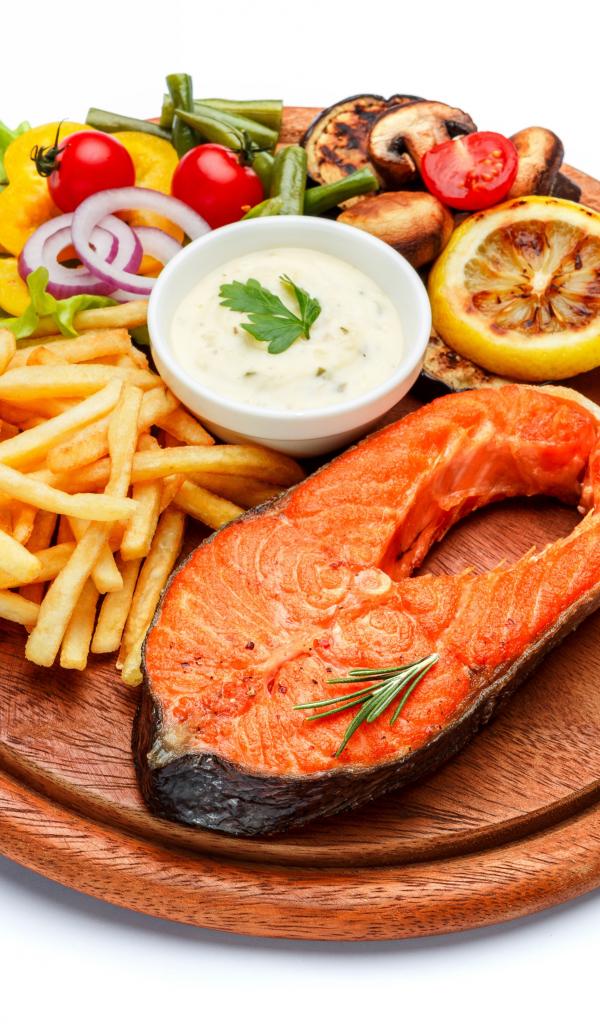 Обои Рыба на доске с картофелем фри, овощами и соусом