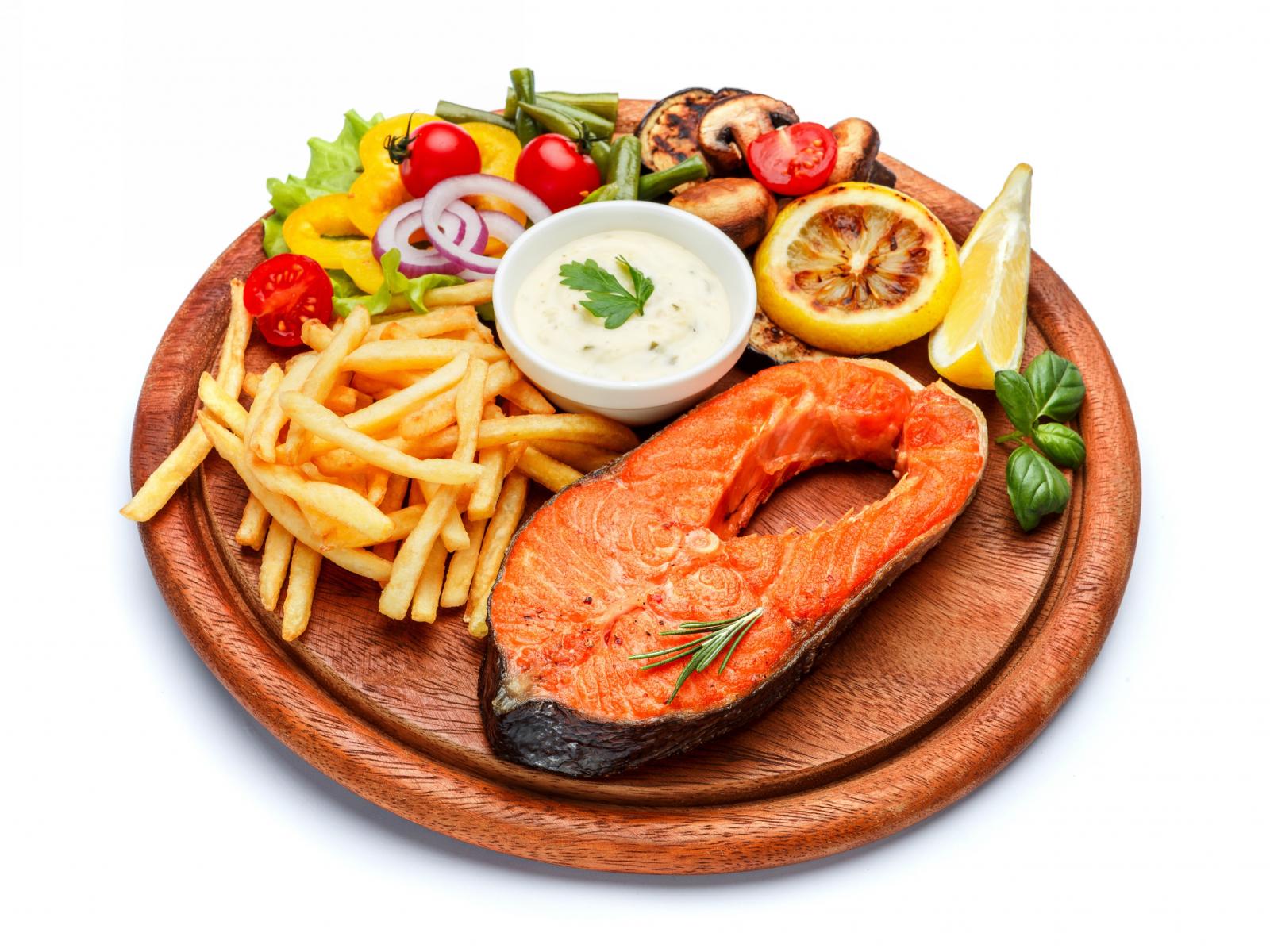 Обои Рыба на доске с картофелем фри, овощами и соусом