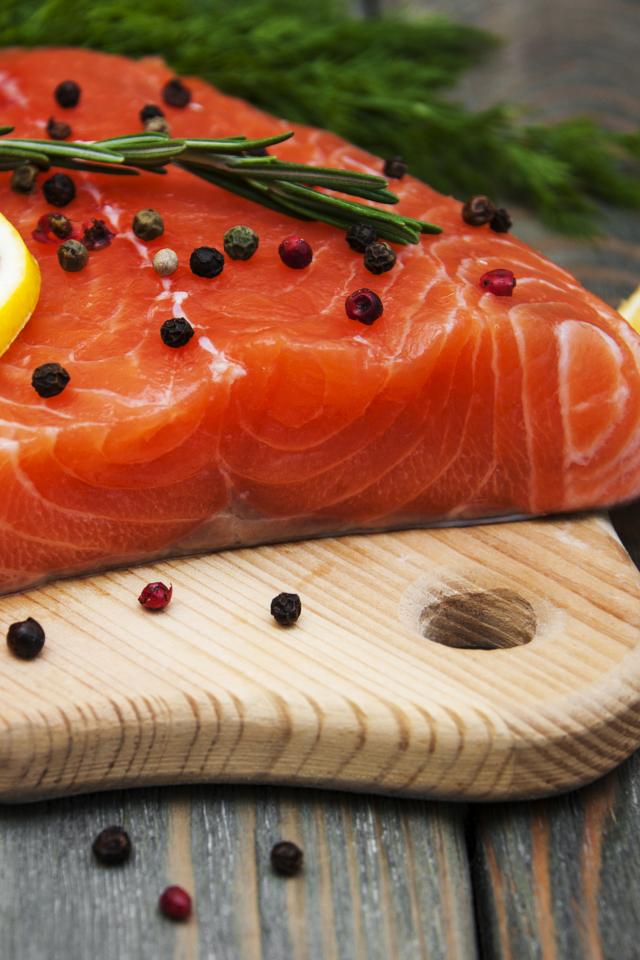 Обои Кусок красной рыбы с лимоном и черным перцем