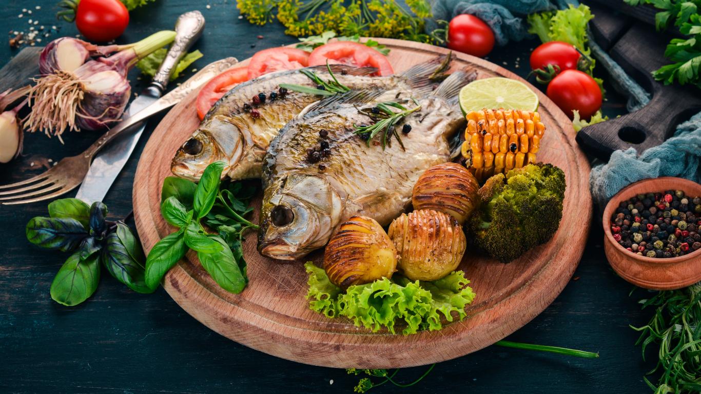 Обои Зажаренная рыба на доске с овощами