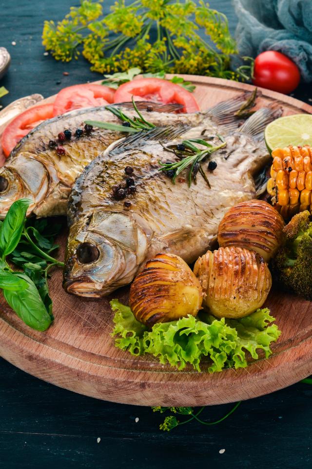 Обои Зажаренная рыба на доске с овощами