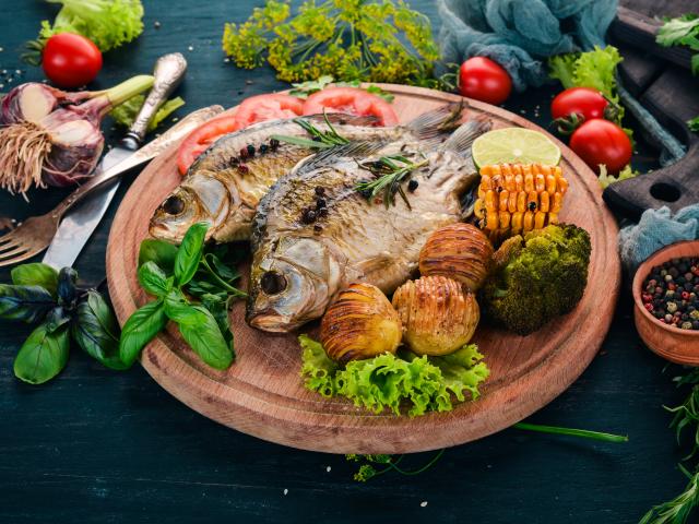 Обои Зажаренная рыба на доске с овощами