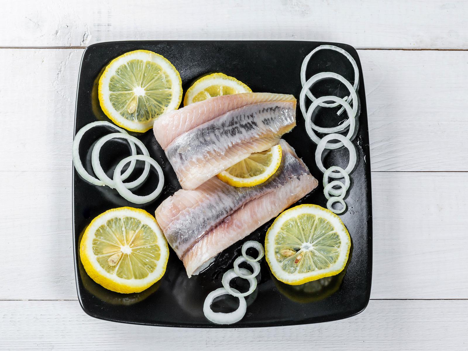 Обои Филе сельди на черной тарелке с луком и лимоном