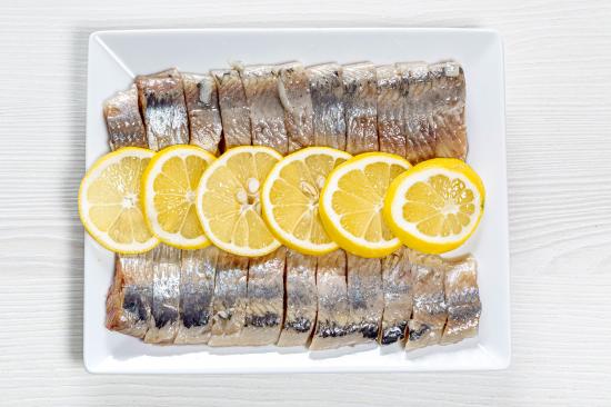 Обои Селедка нарезанная кусочками на белой тарелке с лимоном