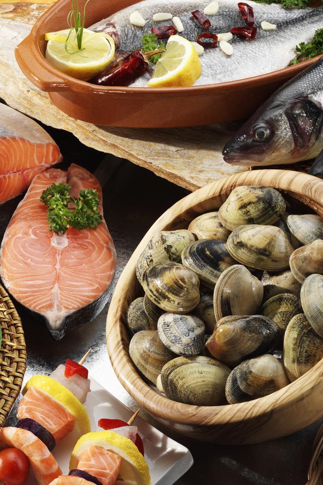 Обои Мидии, креветки и свежая рыба на столе