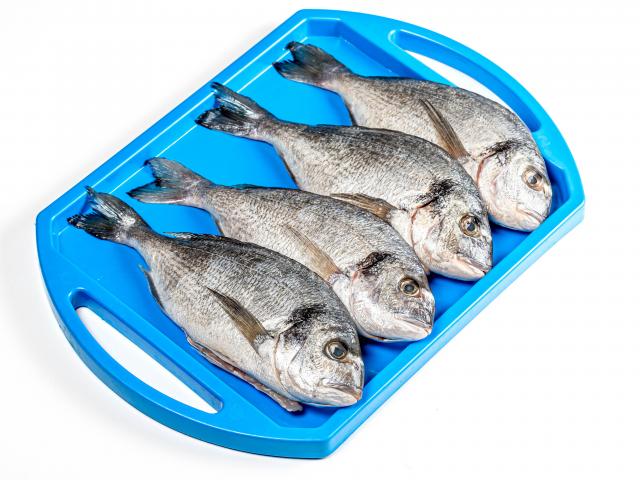 Обои Свежая рыба на голубом подносе на белом фоне