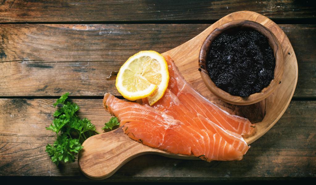 Обои Кусочки красной рыбы с лимоном на столе с черной икрой