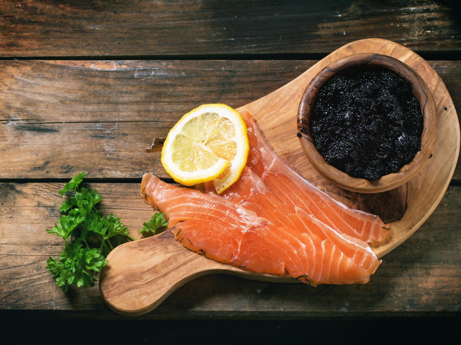 Обои Кусочки красной рыбы с лимоном на столе с черной икрой