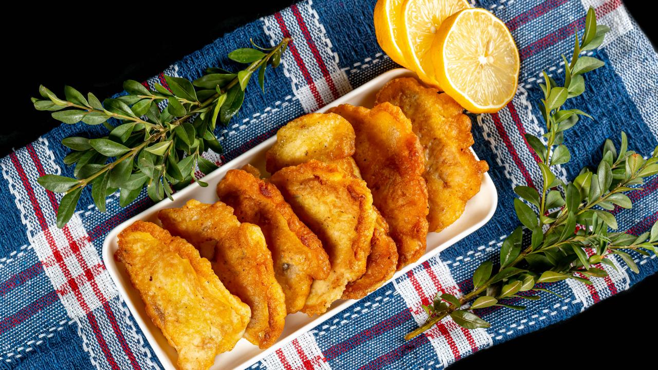 Обои Жареная рыба в кляре на столе с лимоном и зеленью