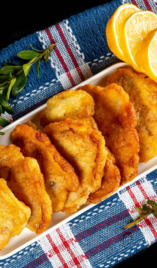 Обои Жареная рыба в кляре на столе с лимоном и зеленью