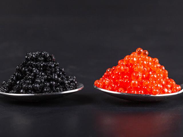 Обои Красная и черная икра на ложках на сером фоне