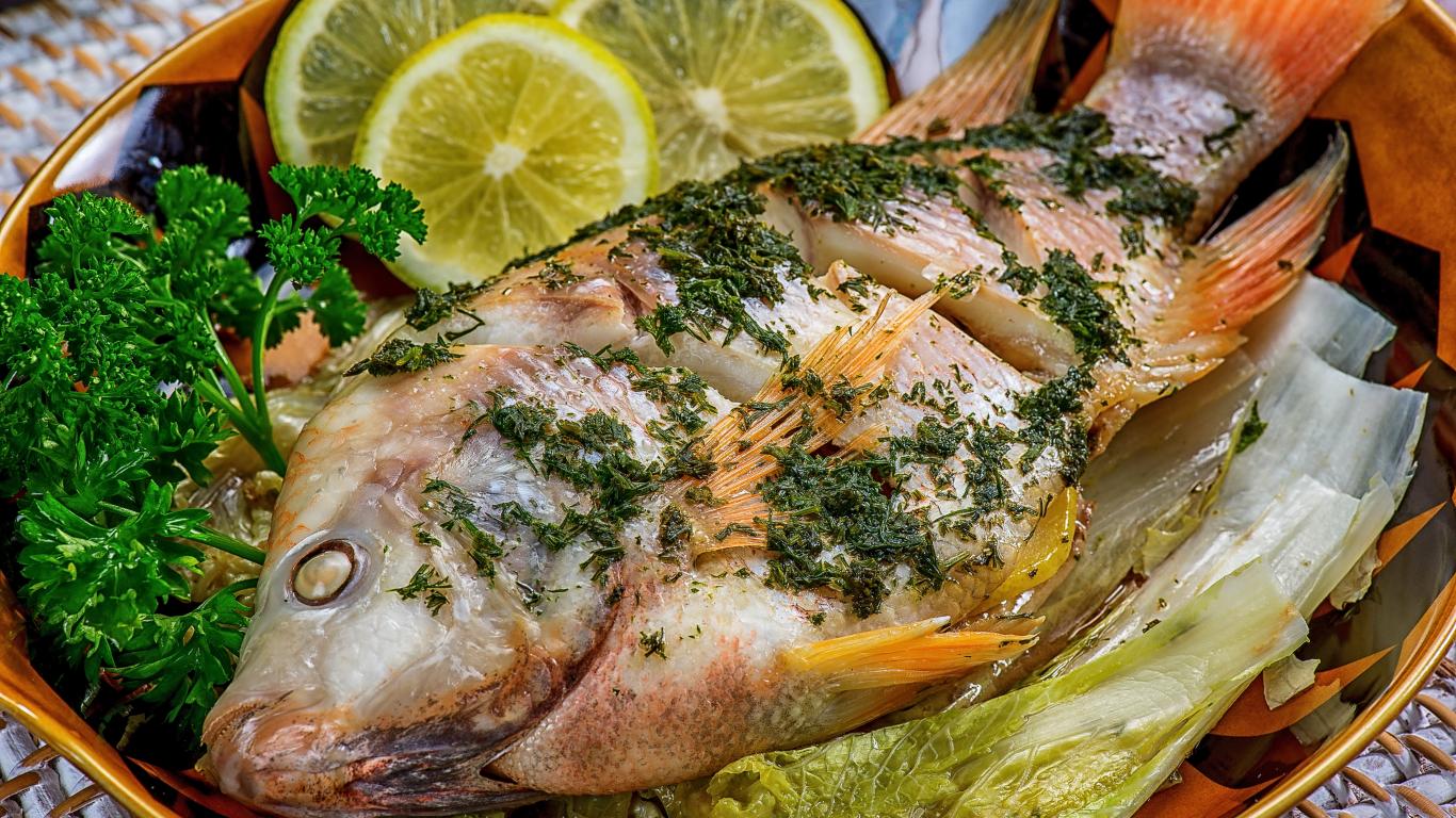 Обои Запеченный карп с лимоном и листьями салата