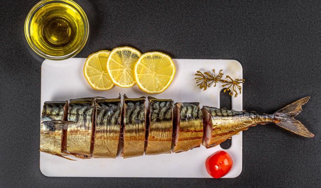 Обои Аппетитная скумбрия на доске с лимоном и маслом
