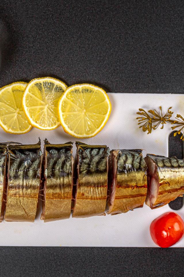 Обои Аппетитная скумбрия на доске с лимоном и маслом