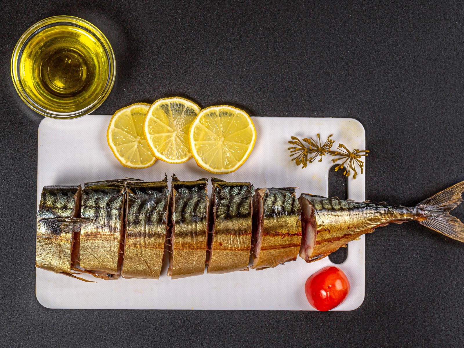 Обои Аппетитная скумбрия на доске с лимоном и маслом