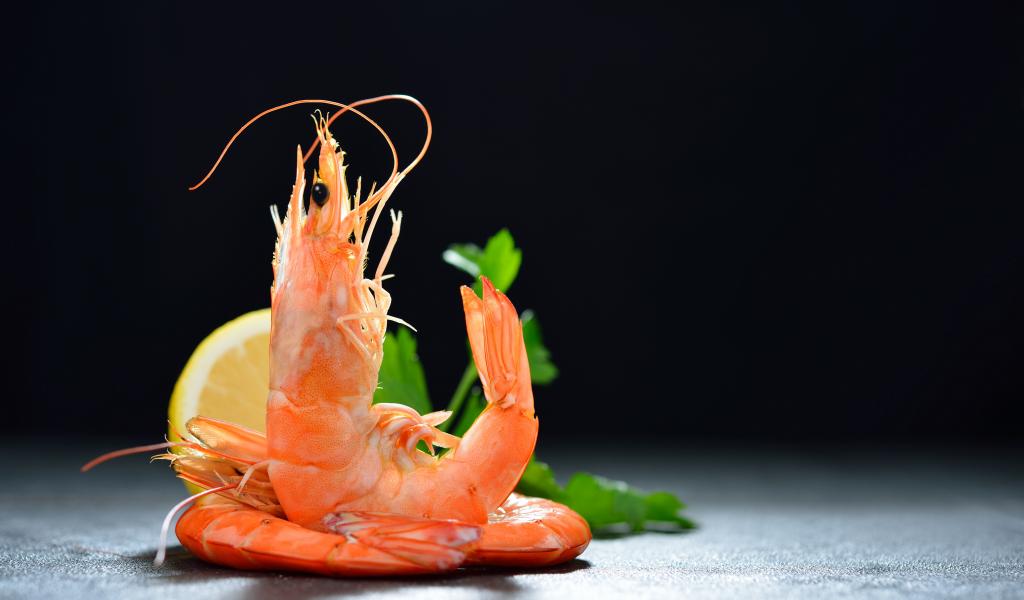 Обои Вареные креветки с лимоном на черном фоне