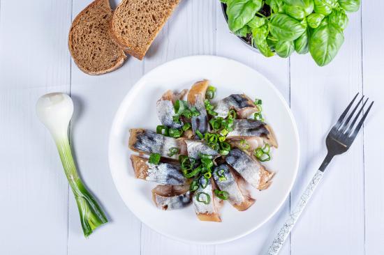 Обои Куски скумбрии на столе с луком, хлебом и базиликом