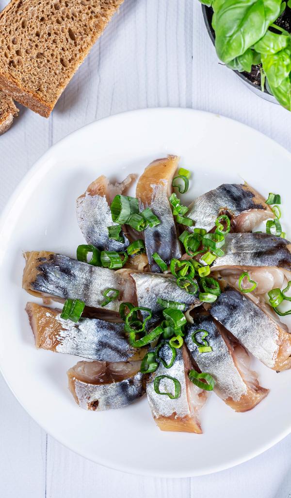 Обои Куски скумбрии на столе с луком, хлебом и базиликом