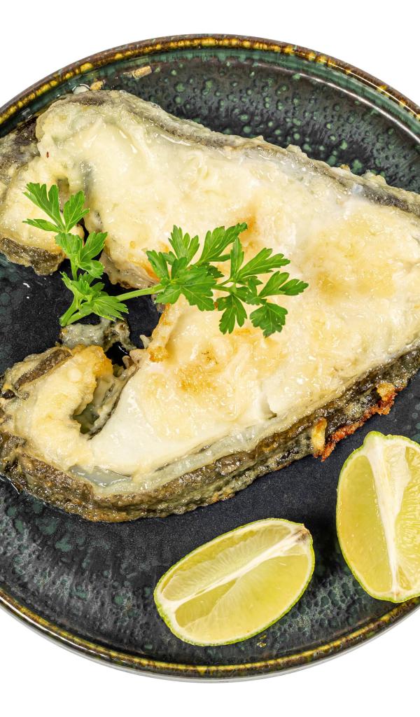 Обои Кусок рыбы на тарелке с лимоном на белом фоне